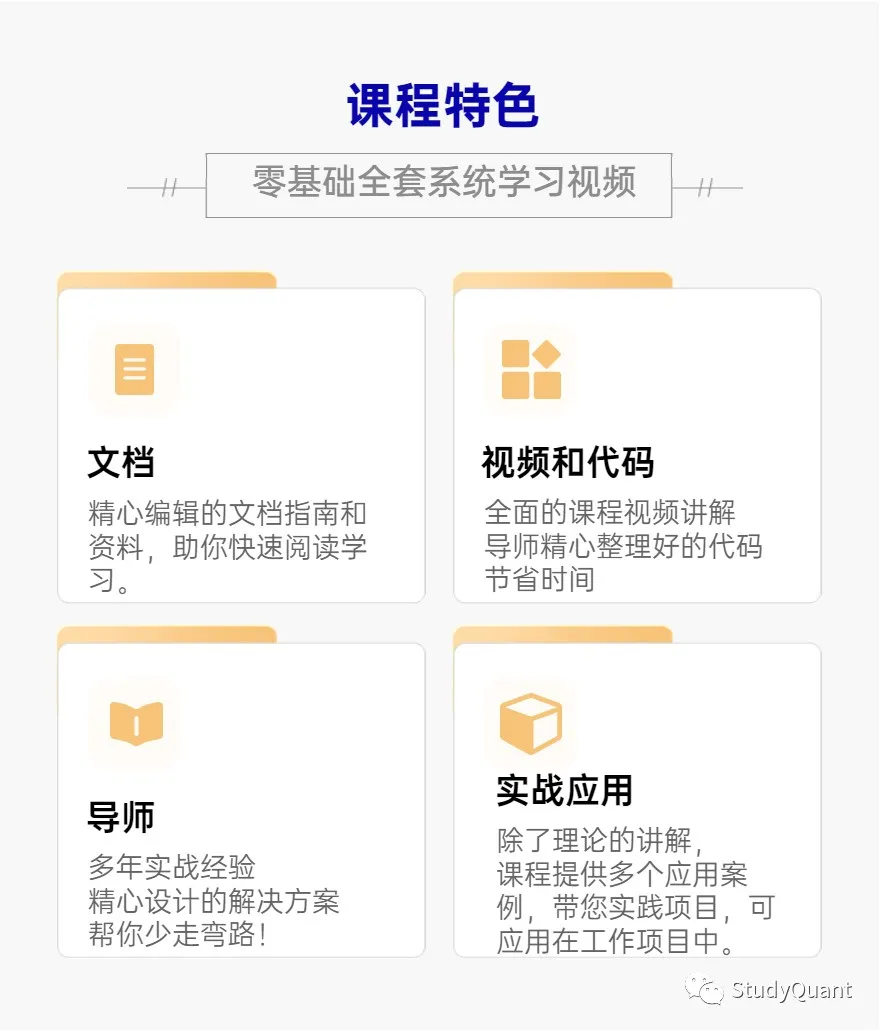 1. 本课程目的为,授人以“渔”而并非授人以“鱼”, 希望教学课程通过我的讲解,能让大家获得相关量化技术及不同大师的投资体系。