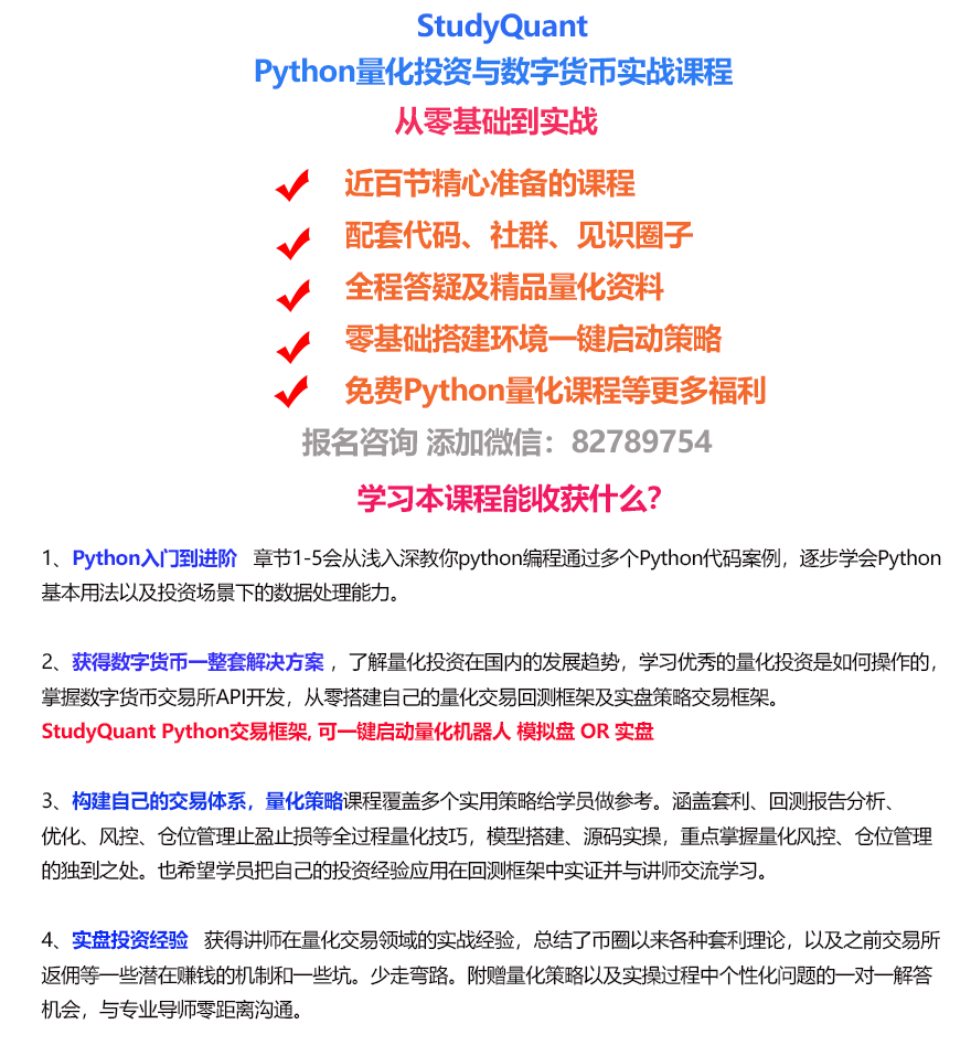 A1: 参加课程,快速学习。无需编程基础,小白从零开始也可入门,从数据,回测框架、回测报告数据可视化及报告分析、实盘接口及经典策略等一整套的数字货币解决方案教学及代码都在这了,从0到1学习量化,节省时间,短时间获得老师数年编程经验。你还在犹豫什么呢?学完课程,也可以服务其他人,往往1个任务就能赚回学费!