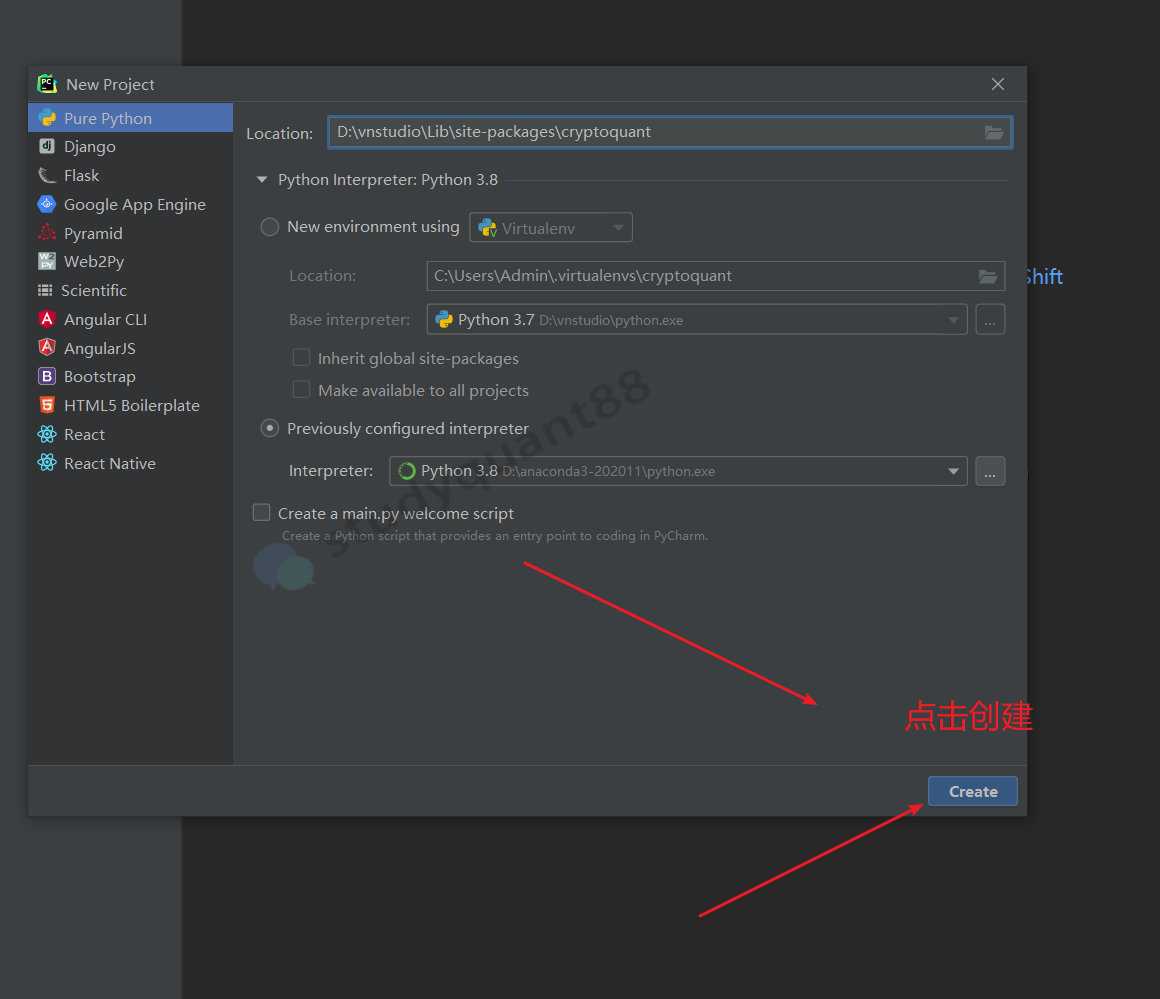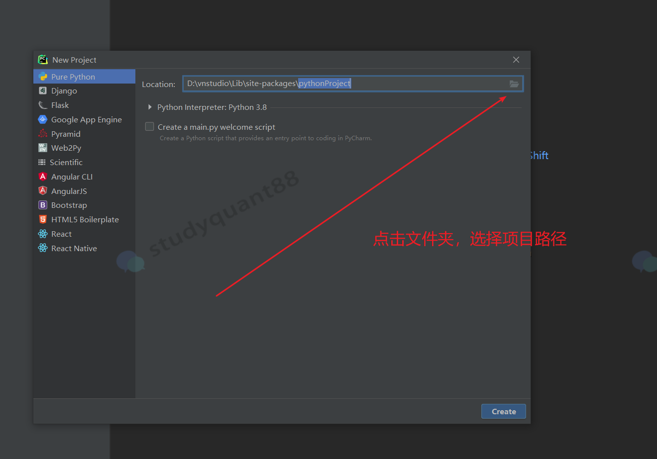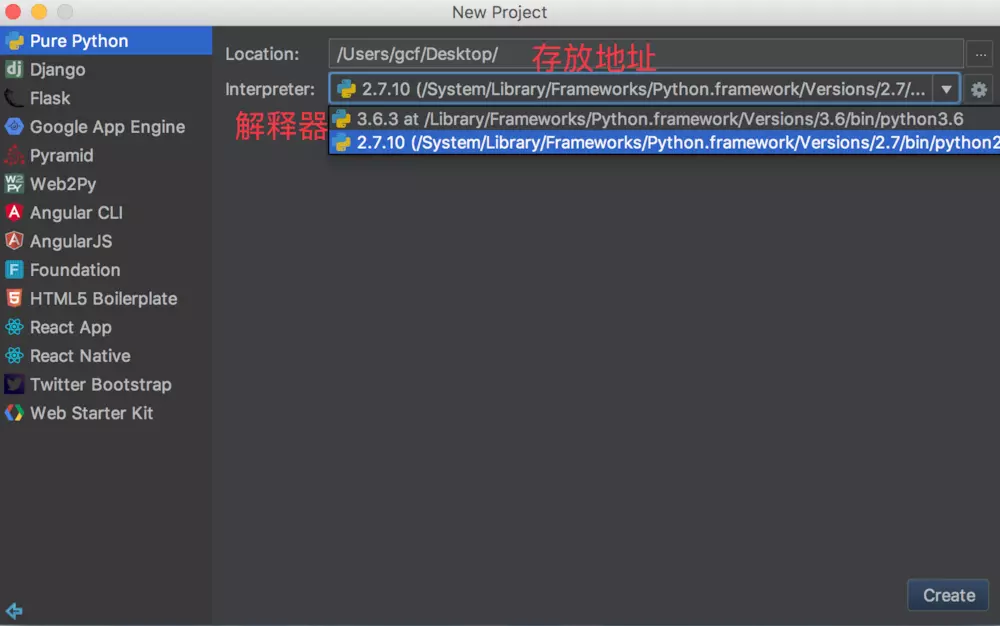 - 接着选择建立一个Python文件,右边第一栏是选择文件的存放地址,第二栏是选择直译器,可以看到这里有两个Python的版本,一个Python2.7,一个是3.6,这取决你自己电脑里安装了几个Python