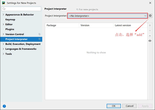 可以看到,"No interpreter" 表示未设置 Python 解释器,这种情况下,可以按图 8 所示,点击设置按钮,选择"add",此时会弹出图 9 所示的窗口。