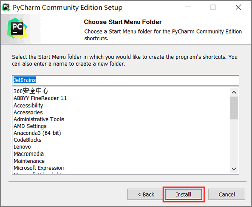 继续点击“Next”,达到图 6 所示的对话框,这里选择默认即可,点击 “Install”,并等待安装进度条达到 100%,PyCharm 就安装完成了。